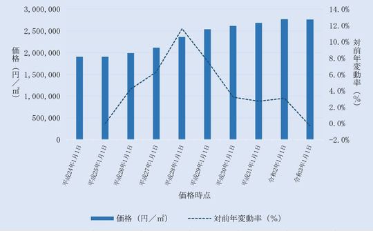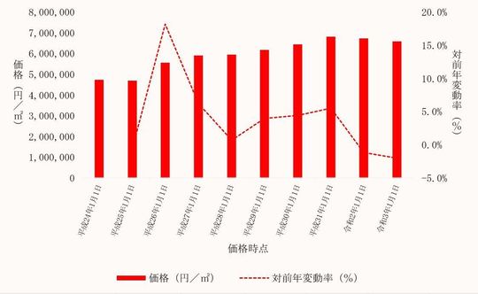 国土交通省から毎年3月に公表される、東京都千代田区内地価公示標準地の用途別平均価格(各年1月1日時点)とその変動の推移をご案内します。
