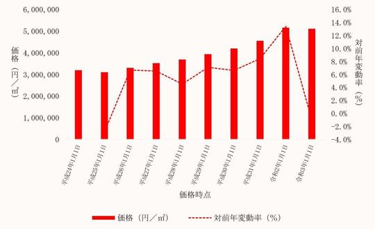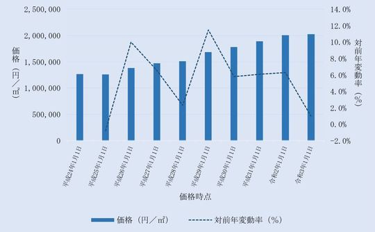 国土交通省から毎年3月に公表される、東京都港区内地価公示標準地の用途別平均価格(各年1月1日時点)とその変動の推移をご案内します。