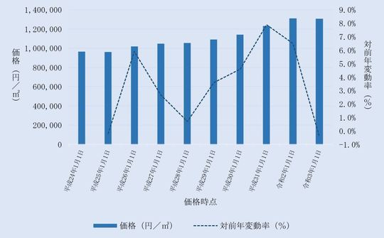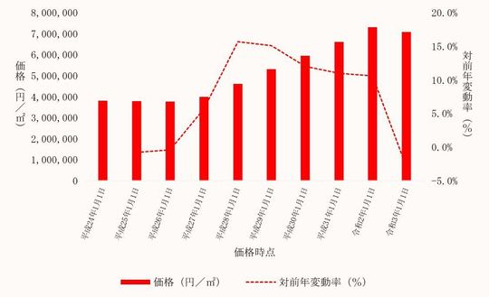 国土交通省から毎年3月に公表される、東京都渋谷区内地価公示標準地の用途別平均価格(各年1月1日時点)とその変動の推移をご案内します。