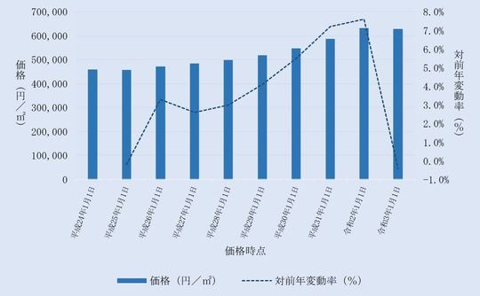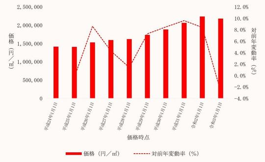 国土交通省から毎年3月に公表される、東京都豊島区内地価公示標準地の用途別平均価格(各年1月1日時点)とその変動の推移をご案内します。