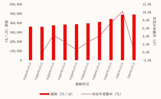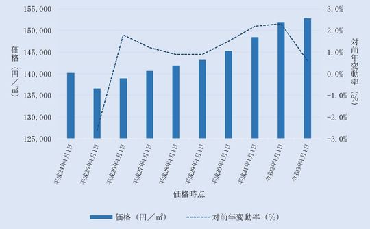 国土交通省から毎年3月に公表される、千葉県船橋市内地価公示標準地の用途別平均価格(各年1月1日時点)とその変動の推移をご案内します。