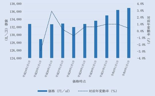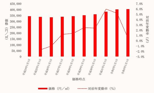 国土交通省から毎年3月に公表される、千葉県松戸市内地価公示標準地の用途別平均価格(各年1月1日時点)とその変動の推移をご案内します。