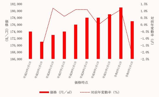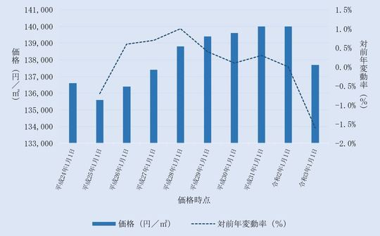 国土交通省から毎年3月に公表される、東京都羽村市地価公示標準地の用途別平均価格(各年1月1日時点)とその変動の推移をご案内します。