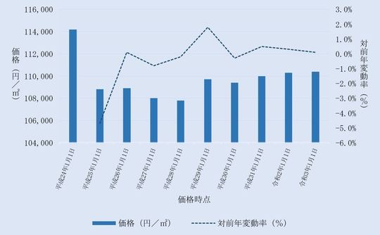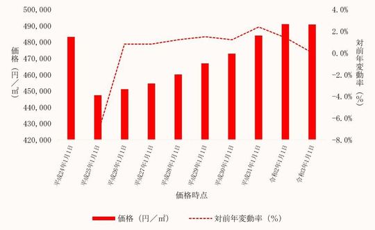 国土交通省から毎年3月に公表される、千葉県柏市内地価公示標準地の用途別平均価格(各年1月1日時点)とその変動の推移をご案内します。