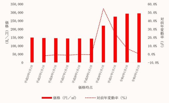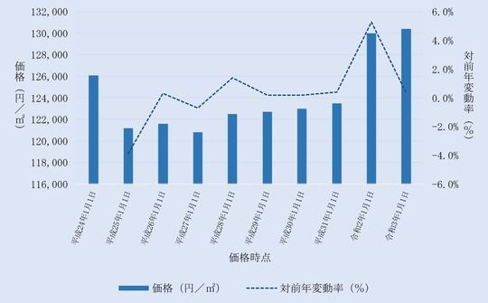 国土交通省から毎年3月に公表される、千葉県流山市内地価公示標準地の用途別平均価格(各年1月1日時点)とその変動の推移をご案内します。