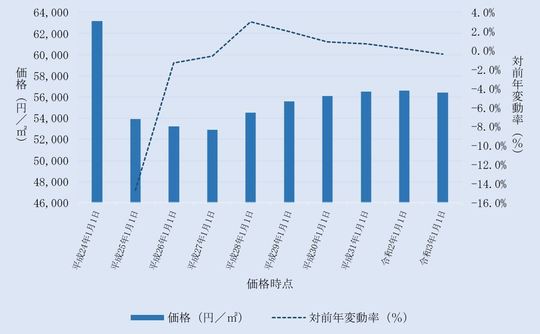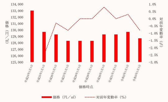 国土交通省から毎年3月に公表される、埼玉県東松山市内地価公示標準地の用途別平均価格(各年1月1日時点)とその変動の推移をご案内します。