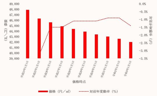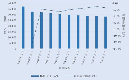 国土交通省から毎年3月に公表される、埼玉県羽生市内地価公示標準地の用途別平均価格(各年1月1日時点)とその変動の推移をご案内します。