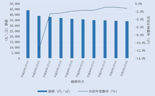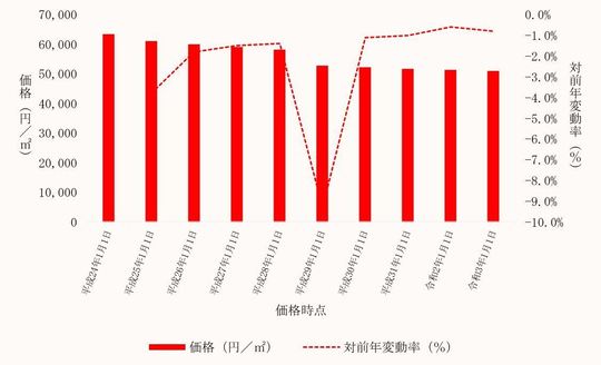 国土交通省から毎年3月に公表される、埼玉県行田市内地価公示標準地の用途別平均価格(各年1月1日時点)とその変動の推移をご案内します。