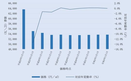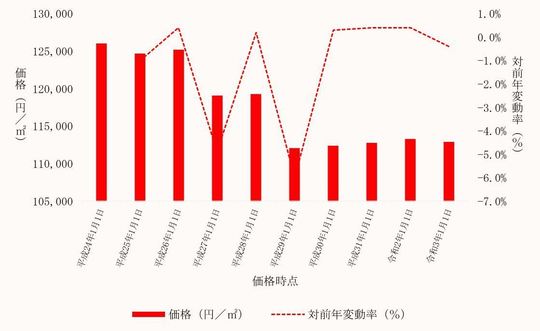 国土交通省から毎年3月に公表される、埼玉県熊谷市内地価公示標準地の用途別平均価格(各年1月1日時点)とその変動の推移をご案内します。