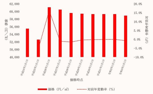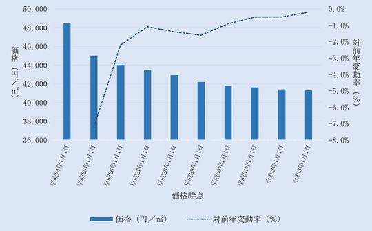 国土交通省から毎年3月に公表される、埼玉県本庄市内地価公示標準地の用途別平均価格(各年1月1日時点)とその変動の推移をご案内します。