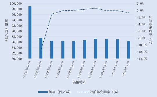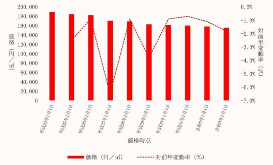 国土交通省から毎年3月に公表される、埼玉県飯能市内地価公示標準地の用途別平均価格(各年1月1日時点)とその変動の推移をご案内します。