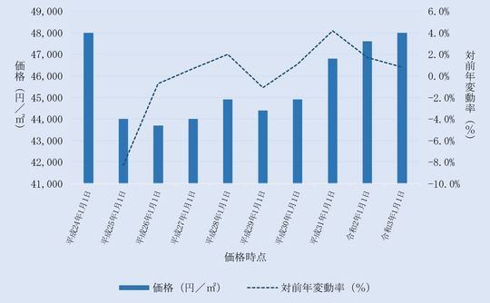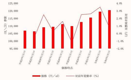 国土交通省から毎年3月に公表される、千葉県市原市内地価公示標準地の用途別平均価格(各年1月1日時点)とその変動の推移をご案内します。