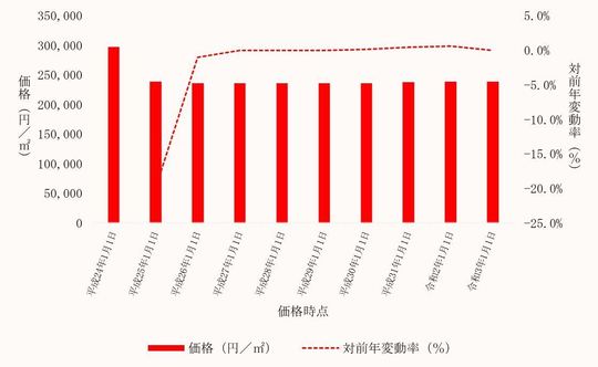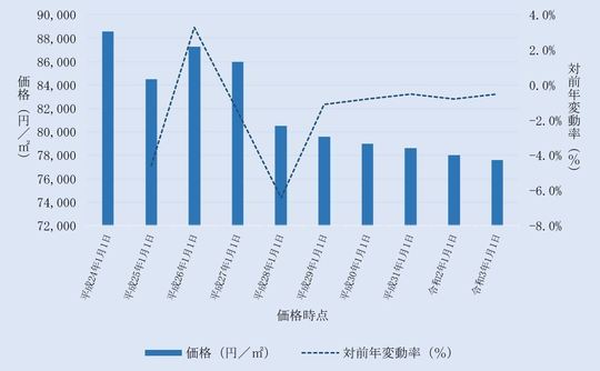 国土交通省から毎年3月に公表される、千葉県我孫子市内地価公示標準地の用途別平均価格(各年1月1日時点)とその変動の推移をご案内します。